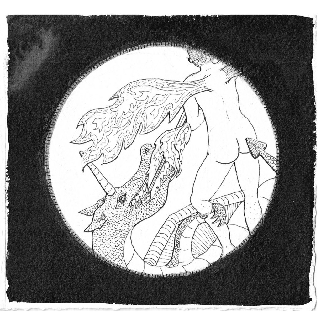 Mythologies vary and the characters in the series are very much becoming my own strangely bastardized creations. I came up with a strange story combining motifs of the angels guarding Eden with their fiery swords and the dragon’s fall from Paradise. In the Biblical narrative humanity is the focus. Nevertheless, the Dragon ends up excluded by the same wall of fiery swords.