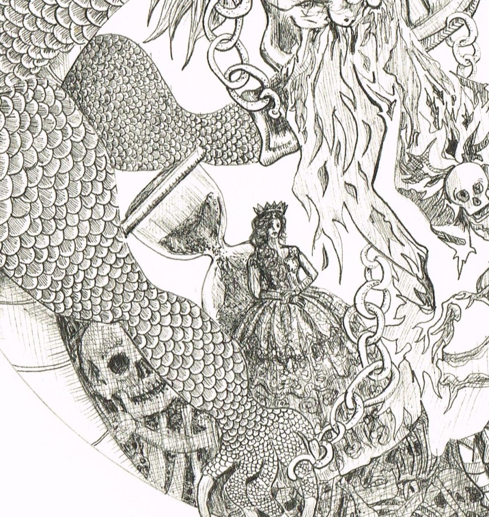 Dancing has always fascinated me so I wanted to bring that movement of dancers into the movement of the flames. The dragon here is laden with jewellery, surrounded by bones. In the distance the figure of Saint George is ready to rescue holding onto a loop from one of the hoard’s chains.