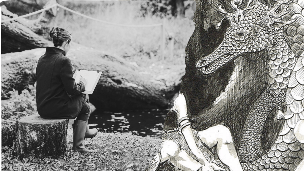 ‘Meeting at the Surface’, ink on paper, 27x22cm‘The Four Rivers of Eden’, ink on paper, 12×16″‘Andromeda and Dragon in a Cave’, 25x26cm‘The Fire Dancers’, ink on paper, 30x27cm‘Leaving Eden’, ink on paper, 41x47cm‘The New Creation’ (purple on green), two layer paper cut, 30x30cm‘Sunset Dragon (oranage on pink)’, two layer papercut, 15x17cm‘Dragon Head’, two layer papercut, 30x30cm‘Sunset Dragon (black on glitter ombre)’, 15x15cm‘Coiling Saint George (green on pink), two layer papercut, 30x30cm‘Dragon Head (green on pink)’, 30x30cm‘The New Creation (test run)’, two layer papercut, 30x30cm‘Coiling Saint George (yellow on blue)’ two layer papercut, 30x30cm‘The Final Fight (orange on red)’, 15x17cm‘Margaret Emerging from a Dragon (lime on glitter blue)’, 30x30cm‘The Final Fight (cyan white)’, laser cut acrylic, 15x17cm‘Dragon Head (yellow on orange)’, two layer papercut, 15x15cm‘The New Creation’, laser cut wood, 30cm diameter