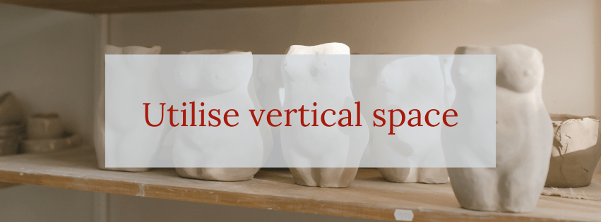 Unless you have very low ceilings there’s generally a gap between comfortable working height and the ceiling height of a room. If you work large this may not be a massive gap. Wherever possible use the ceiling and the higher areas of wall for storage.